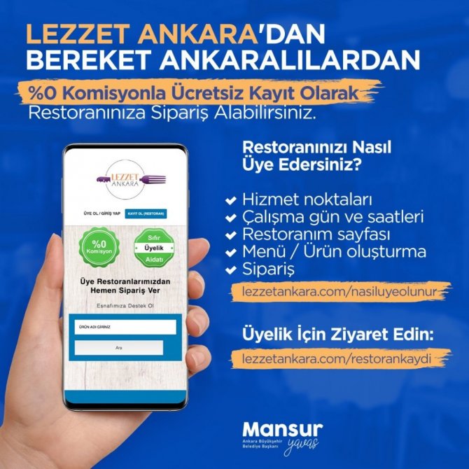 Pandemi sürecinde örnek toplumsal dayanışma projelerini hayata geçirerek vatandaşlar ile zor günler geçiren sektör çalışanları ve esnafın yanında olan Ankara Büyükşehir Belediye Başkanı Mansur Yavaş, çeşitli meslek gruplarına ve esnafa yönelik sürdürdüğü destekleri çeşitlendirmeye devam ediyor. Geçtiğimiz aylarda lokanta ve kafelerin listesini paylaşan ve Ankaralıları bu işletmelere destek olmak için sipariş vermeye davet eden Yavaş, şimdi de lokanta ve kafe işletmecilerini "Lezzet Ankara" portalına kaydolmaya davet etti. Sosyal medya hesapları üzerinden "Lezzet Ankara'dan bereket Ankaralılardan" diyen Yavaş, "Esnafımızın alın terini korumak adına yüzde sıfır komisyonla "Lezzet Ankara" var. İşletmelerimizin menülerini sisteme girmesinin ardından portalımızı sizlerle buluşturacak olmanın heyecanını yaşıyoruz" dedi.