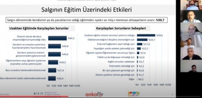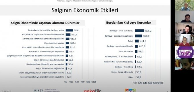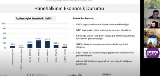 Prof. Dr. Emre Erdoğan anket sonuçlarına göre, Ankara'da yaşayan insanların yüzde 59'luk kesiminin salgından ekonomik olarak olumsuz etkilendiğini tespit ettiklerini, katılımcıların sadece yüzde 9'unun ise rahatça yaşamak için yeterli geliri olduğunu söyledi. Zoom toplantısında ayrıca anketle elde edilen önemli bir diğer verinin ise salgın döneminde her 4 katılımcıdan birinin borç aldığını ortaya çıkardığına dikkat çekildi.