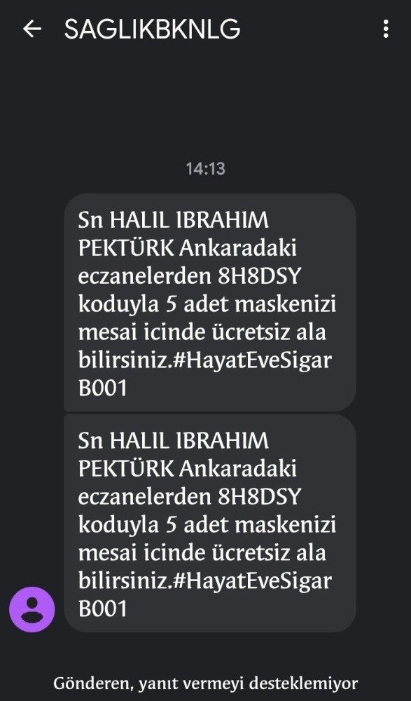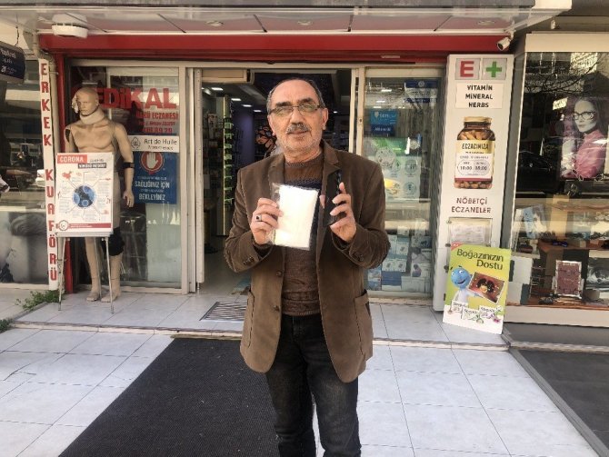 Telefonundaki kod ile maskesini almak için eczaneye gelen Halil İbrahim Pektürk, Sağlık Bakanlığından cep telefonuna gelen kod ile eczaneye geldiğini söyleyerek, “5 tane maske aldım. Kod yaklaşık 1 saat önce geldi. Bir dahaki hafta başka bir kod gelecekmiş ve herhangi bir eczaneden maskemi alabilirmişim” ifadelerini kullandı.