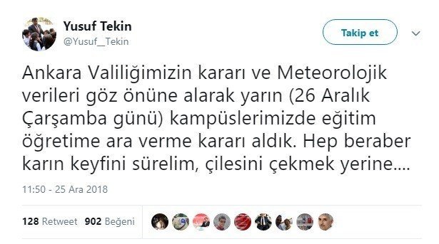 "Ankara Valiliğimizin kararı ve Meteorolojik verileri göz önüne alarak yarın (26 Aralık Çarşamba günü) kampüslerimizde eğitim öğretime ara verme kararı aldık. Hep beraber karın keyfini sürelim, çilesini çekmek yerine...”
