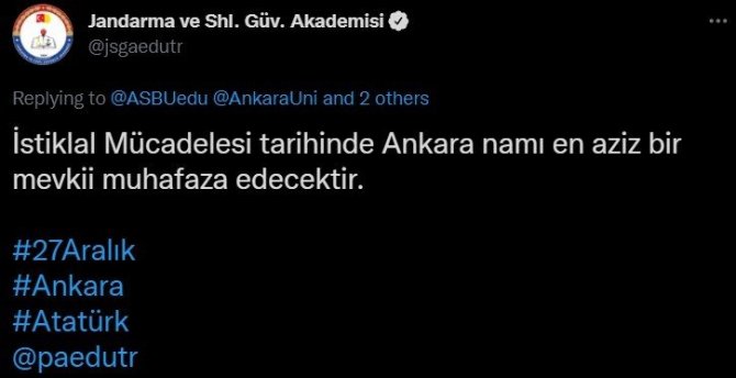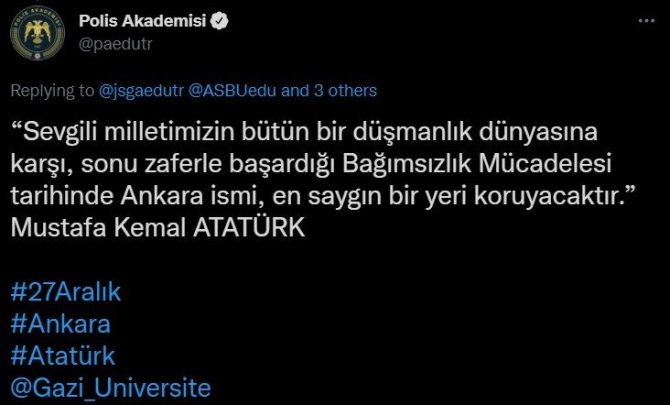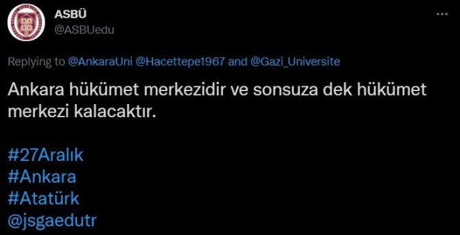Ankara'nın üniversitelerinden; Gazi Üniversitesi, Hacettepe Üniversitesi, Ankara Üniversitesi, Ankara Sosyal Bilimler Üniversitesi, Jandarma ve Sahil Güvenlik Akademisi ve Polis Akademisi, Ulu Önder Mustafa Kemal Atatürk'ün Ankara'ya gelişinin 102. yıl dönümü vesilesiyle sosyal medya üzerinden birbirini etiketleyerek, Atatürk'ün sözlerinin yer aldığı bir dizi paylaşım yaptı.