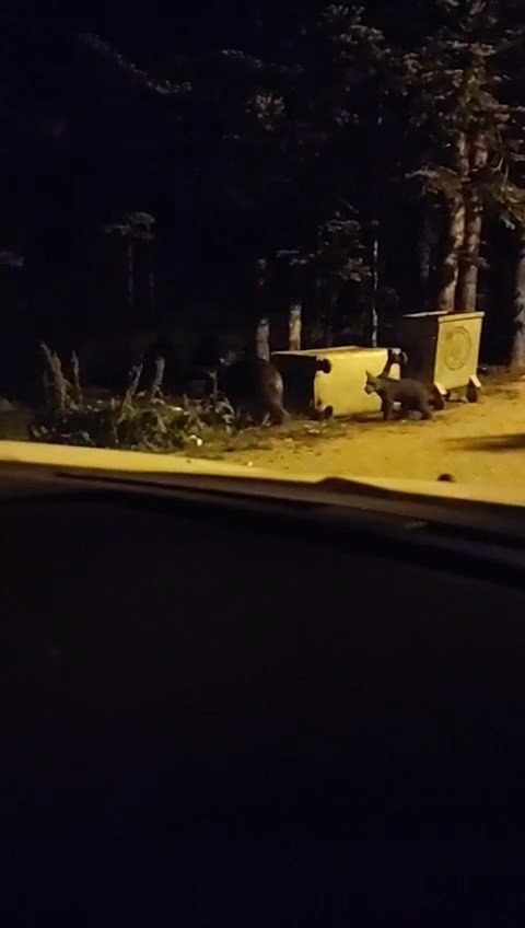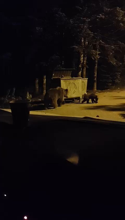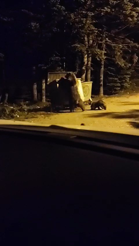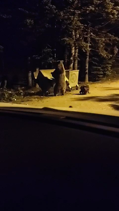 Uludağ Sarıalan bölgesinde aç kalan anne ayı ve 2 yavrusu karanlıkta kalan çöp konteynerinin yanında bir süre arandıktan sonra çöp konteynerini devirerek yiyecek aradı. O anlar cep telefonu kamerasına yansıdı. Geçtiğimiz hafta sonu gerçekleştirilen bisiklet yarışı sonrası çöplerde kalan yiyeceklerle kendilerine ziyafet çeken ayılar renkli görüntüler ortaya çıkardı.
