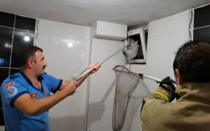 Bursa'nın İnegöl ilçesinde meydana gelen olayda havalandırma boşluğuna düşen yavru kedi, itfaiye ekiplerince kurtarıldı.