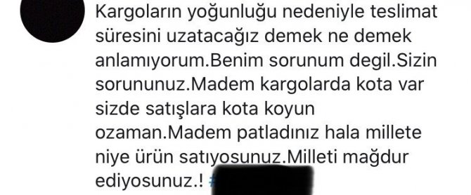 Geride bıraktığımız 10 Mayıs Anneler Günü için sipariş edilen hediyelerde de tam bir hüsran yaşanıyor. Kargo şirketlerinde yoğunluğun da etkilediği duruma isyan eden vatandaşlar, sosyal medyada halen annelerine aldıkları hediyelerin ulaşmamasından dolayı serzenişte bulunuyor. Kullanıcıların alışveriş yaptıkları e-ticaret platformunu sert bir dille eleştirdikleri görülüyor. Ticaret Bakanlığı’nın e ticaret uygulamalarını daha yakından mercek altına almasını isteyen vatandaşlar, mevcut olmayan malın satışına müsaade edilmemesi gerektiğine işaret ediyorlar. Bu arada kargo firmalarının da kapasite artışına gitmeyerek, yüzde 40 artan iş yükünü aynı ekip ile sürdürme konusunda ısrarcı olması hizmet kalitesini düşürüyor.