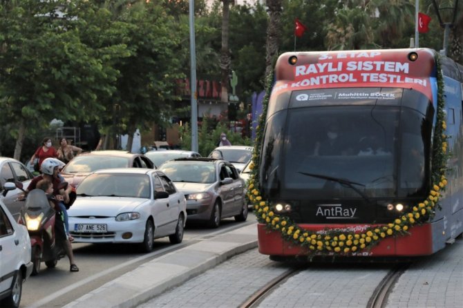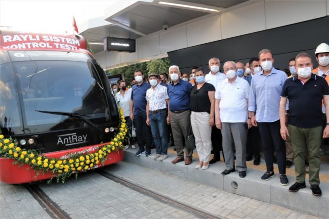 Antalya Büyükşehir Belediyesinin kent içi toplu taşımada konfor ve hızlı ulaşım sağlayacak 3. Etap Raylı Sistem Projesi tüm hızıyla devam ediyor. Varsak'ı, Otogar, Antalya Eğitim Araştırma Hastanesi ile şehir merkezine bağlayacak 3. Etap Raylı Sistem Projesi çalışmalarında etap etap sona yaklaşılıyor. Projede ilk test sürüşü bugün CHP'li 10 büyükşehir belediye başkanın katılımı ile başladı. Test sürüşünde Antalya Büyükşehir Belediye Başkanı Muhittin Böcek'in daveti üzerine İstanbul Büyükşehir Belediye Başkanı Ekrem İmamoğlu, Ankara Büyükşehir Belediye Başkanı Mansur Yavaş, İzmir Büyükşehir Belediye Başkanı Tunç Soyer, Muğla Büyükşehir Belediye Başkanı Osman Gürün, Aydın Büyükşehir Belediye Başkanı Özlem Çerçioğlu, Adana Büyükşehir Belediye Başkanı Zeydan Karalar, Mersin Büyükşehir Belediye Başkanı Vahap Seçer ve Tekirdağ Büyükşehir Belediye Başkanı Kadir Albayrak yer aldı.