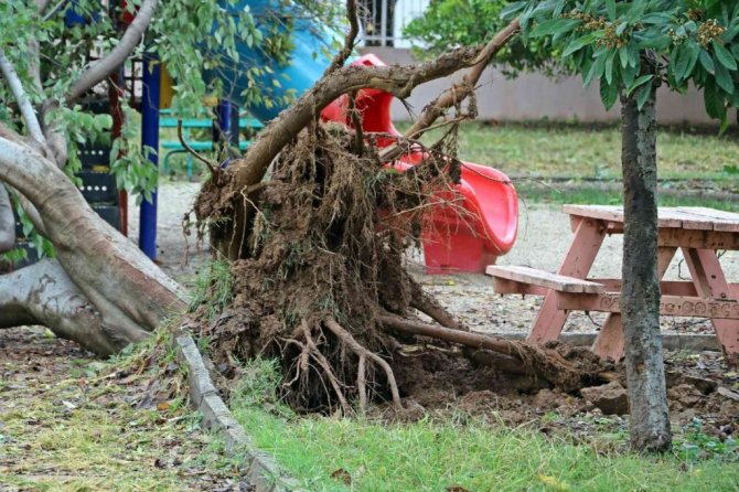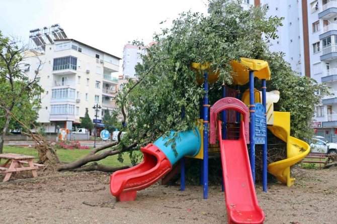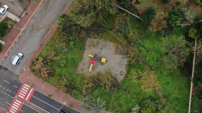 Antalya'da dün akşam saatlerinde sağanak ve şiddetli rüzgar etkili oldu. Muratpaşa ilçesine bağlı Yeşilbahçe Mahallesi'nde ise akşam saat 20.00 sıralarında hortum çıktı. Bir çocuk parkındaki ağaçları devirerek sitelere doğru ilerleyen hortum, dairelerin balkonlarındaki panjurları parçaladı. Çatılardaki gün ısılarını da söken hortum, tabelaları da devirdikten sonra bir başka çocuk parkındaki ağaçları da devirdi. Olayda yaralanan olmazken, üzerine ağaç devrilen bir araçta hasar oluştu. Hortum anı sitenin güvenlik kamerasına da saniye saniye yansıdı. Görüntülerde, saat 20.09'da şiddetli rüzgarın bir anda artması ve hortumun ağaçlar ile tabelaları yerinden sökmesi yer aldı.