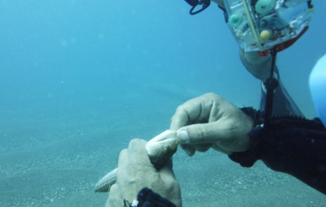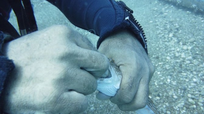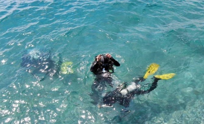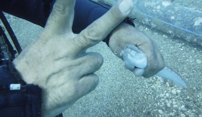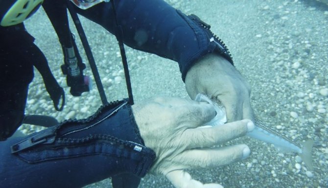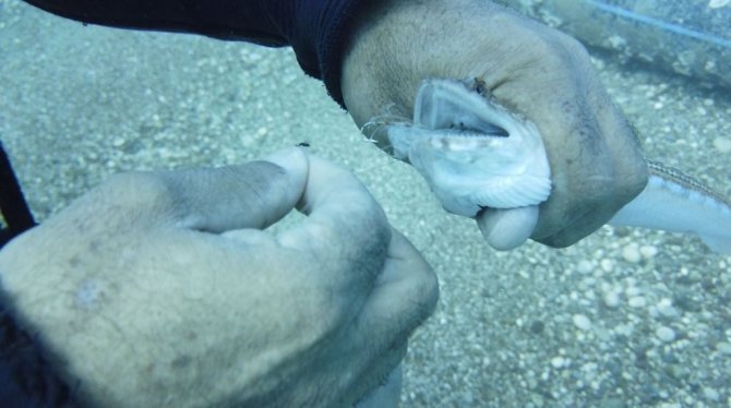 Konyaaltı Sahili'nde geçtiğimiz günlerde öğrencileriyle birlikte dalış yapan Akdeniz Üniversitesi (AÜ) Su Ürünleri Fakültesi Öğretim Üyesi Prof. Dr. Mehmet Gökoğlu, iki olta iğnesi yutmuş halde dolaşan bir lokum balığını fark etti. Misinayı tutup balığı eliyle yakalayan Gökoğlu, iğneyi çıkartmak için operasyona başladı. Birinci iğneyi başarıyla çıkartan Gökoğlu, ardından ikinci iğneyi de çıkardı. Başarılı operasyonlar sonrası tekrar doğal yaşamına bırakılan lokum balığı bölgeden uzaklaştı. O anlar ise su altı kamerasına saniye saniye yansıdı.
