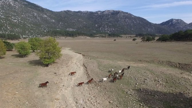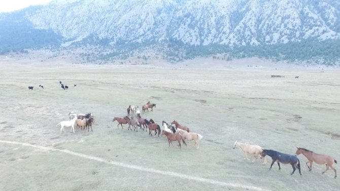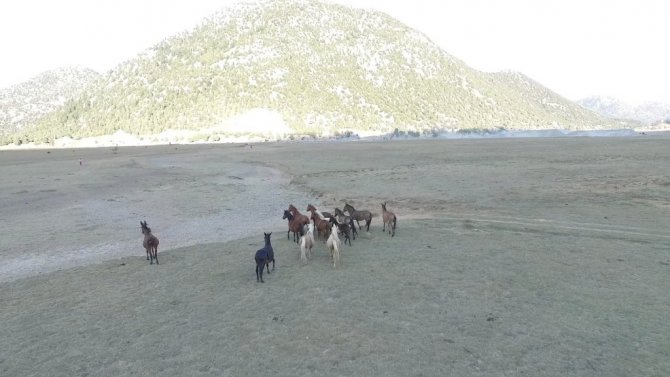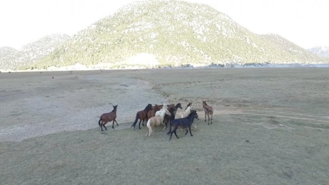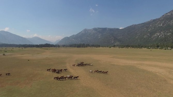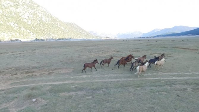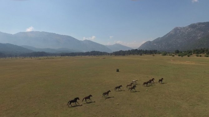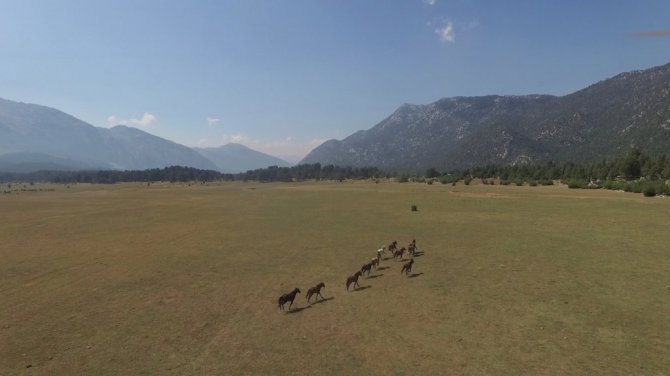 Antalya'da bulunan "Eynif Ovası"nın en önemli değerlerinden olan Yılkı atları havadan görüntülendi.