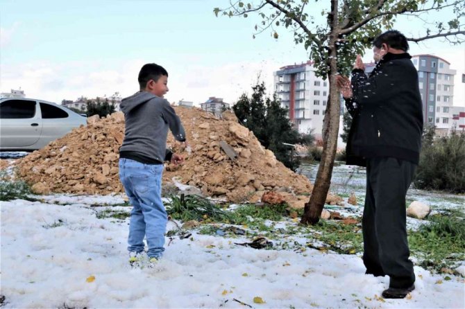 Torunu ile oynayan Adnan Saraç, "Sabah kalktım bölgemizde dolu var. Çok yağmış. Fotoğraf çektim. Çocukları getirdim, okula götürecektim. Görünce durdum kartopu oynadım. Çocuklar mutlu oldu" dedi.