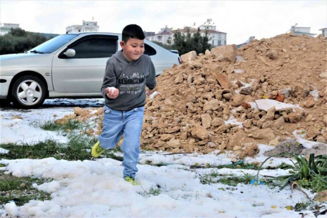Meteoroloji Genel Müdürlüğü'nün dün "turuncu" kod vererek uyardığı Antalya'da bugün sabah saatlerinde dolu etkili oldu. Yağan dolunun ardından vatandaşlar kar topu yaparak oynadı.
