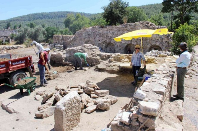 Cadde üzerinde bulunan tarihi yapılar hakkında bilgi veren Kazı Başkanı Prof. Dr. Söğüt, "Bunları içinde özellikle farklı kurumlarla birlikte yürüttüğümüz çalışmalardan birisi burası. Hemen Gymnasiuam'un çıkışında kapı ile caddeye bir bağlantı var. Yani proplyon denilen yapıya buradan geçiyorsunuz. Sonrasında 10 metre genişliğinde bir cadde var ki, antik dönemin ve bu kentin en büyük caddelerinden birisi. Bu caddeye hiçbir araç girmiyordu ve bu cadde bir tören caddesini biz burada açığa çıkartıyoruz. Caddenin hemen içinde Roma dönemi düzenlemelerinin haricinde Bizans döneminde eklenmiş bir kilise, daha sonra bu kilesinin yıkılmasından sonra düzenlenmiş mezarlar da vardı. Caddenin hemen güneyinde Latrina (Tuvalet) var. Yani 92 kişilik ve antik dönemin büyük Latrinalarından birisi. Orayı biz Türk Tarih Kurumu aracılığı ile restorasyon çalışmalarımızı gerçekleştiriyoruz. Hemen onun yanında Roma hamamı var. Yani bu kentteki 3 Roma hamamından birisi burada. Caddede yine Muğla Valiliğimizin desteği ile kazılarımızı gerçekleştiriyoruz. Böylece biz hem Bakanlığımız, hem valiliğimiz ile birlikte buradaki çalışmalarımızı yürütüyoruz" dedi.
