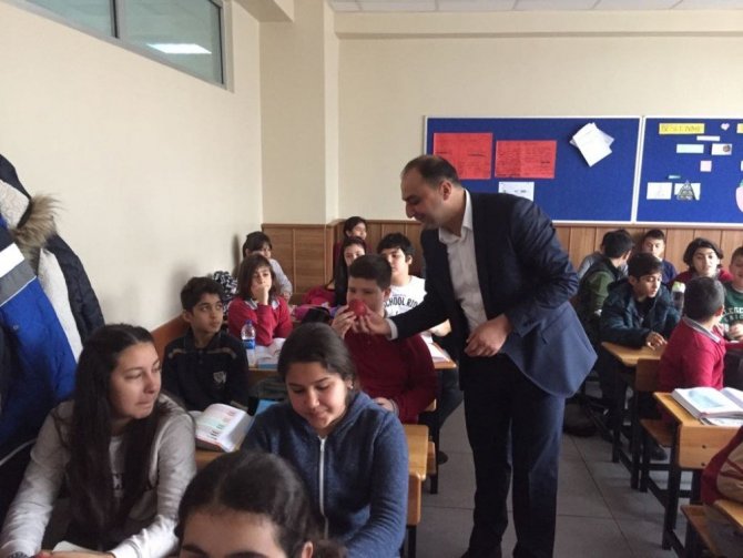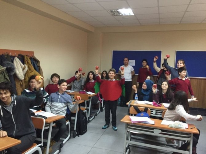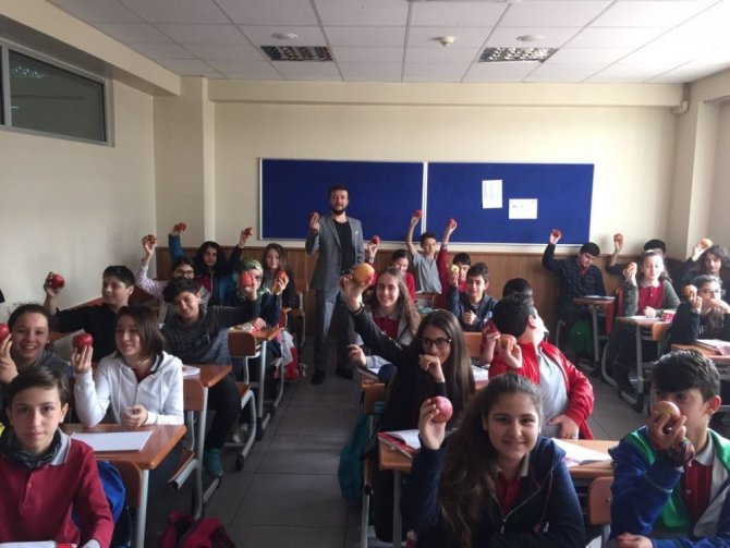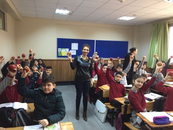 Beslenme Dostu okul olan Manisa’nın Yunusemre ilçesindeki Şehit Ömer Halisdemir Ortaokulundaki 1.100 öğrenciye sağlıklı beslenmeye ve ara öğünün önemine dikkat çekmek için 240 kilogram elma dağıldı.