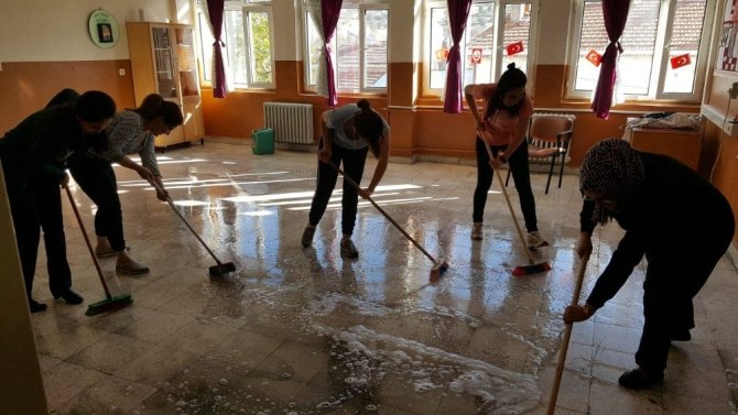 Kütahya’nın Domaniç İlçesine bağlı Çukurca Şehit Veli Selçuk İlk ve Ortaokulu’nda idareci ve öğretmenler, temizlik çalışması yaparak okulu ara tatil sonrasına hazırladı.