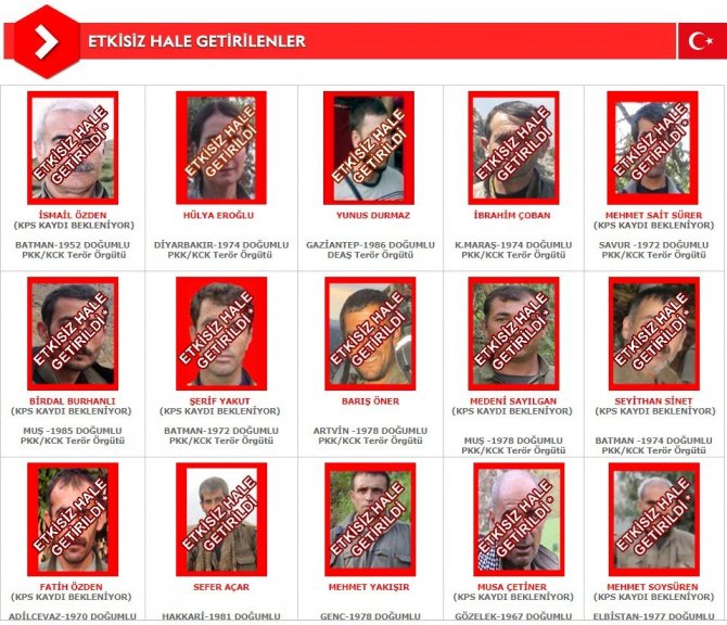 Derecelerine göre 5 kategoride aranan terörist listeleri temizleniyor. Listelerden bugüne kadar 238 terörist etkisiz hale getirildi.Listeden düşen teröristlerin başlarına konan ödül tutarı ise toplamd...