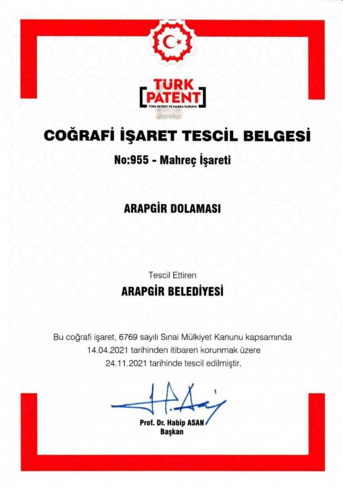 Malatya mutfağının vazgeçilmez lezzetleri arasında yer alan " Arapgir Dolaması" için Coğrafi İşaret Tescil Belgesi alındı.