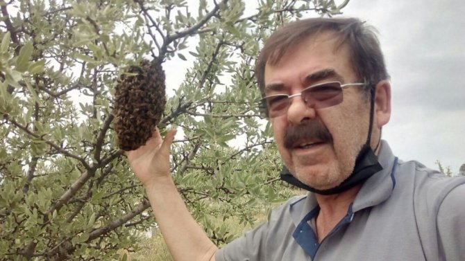 Denizli Arı Yetiştiricileri Birliği Başkanı Nihat Çomak, kovanların kaçarak oğul çıkaran ve bir ağaçta toplanan iki koloni binlerce arıyı üzerine özel kıyafet giymeden çıplak elle toplayarak tekrar kovanlarına yerleştirdi.