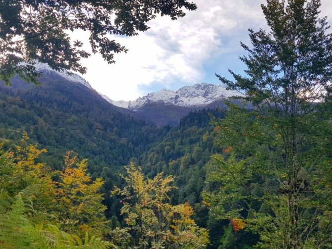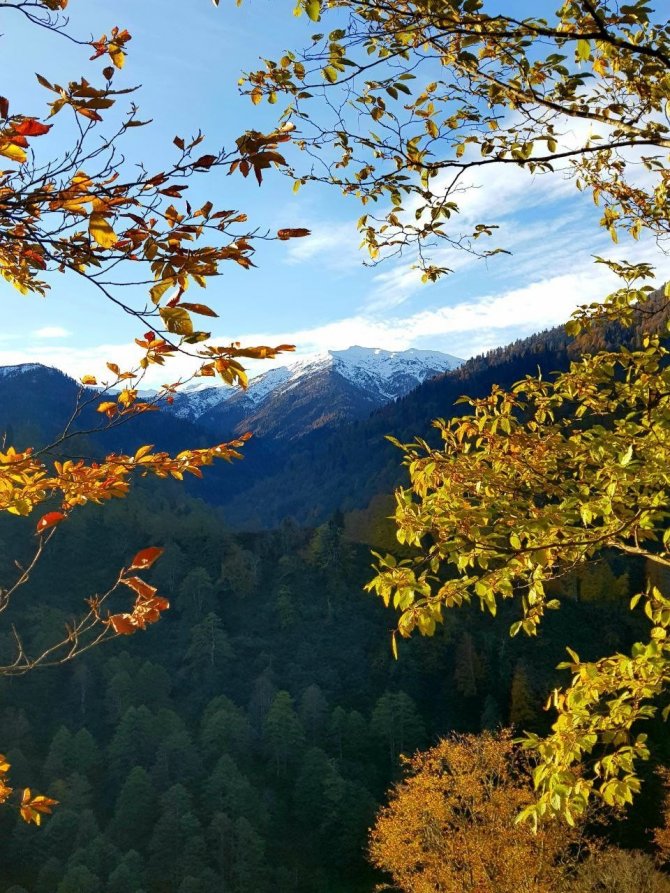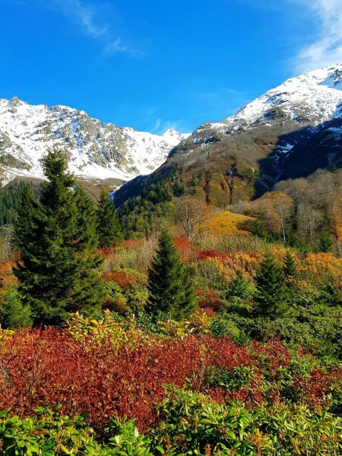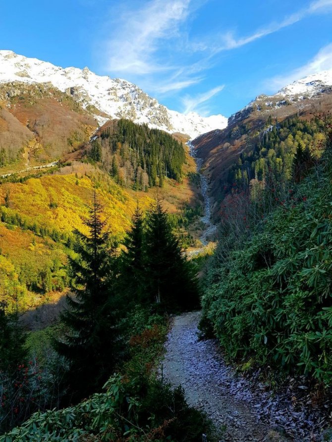 Türkiye'nin kuzeydoğu sınırında doğal güzellikleriyle dikkati çeken Artvin, özellikle sonbaharda oluşan renk cümbüşüyle görenleri kendine hayran bıraktırıyor. Artvin'in Borçka ilçesindeki Macahel vadisi sonbahar renkleriyle bütünleşirken, 3 bin 400 metre rakımda bulunan Karçal Dağı'ndaki beyaz örtü ile birlikte kartpostallık görüntüler oluştu.