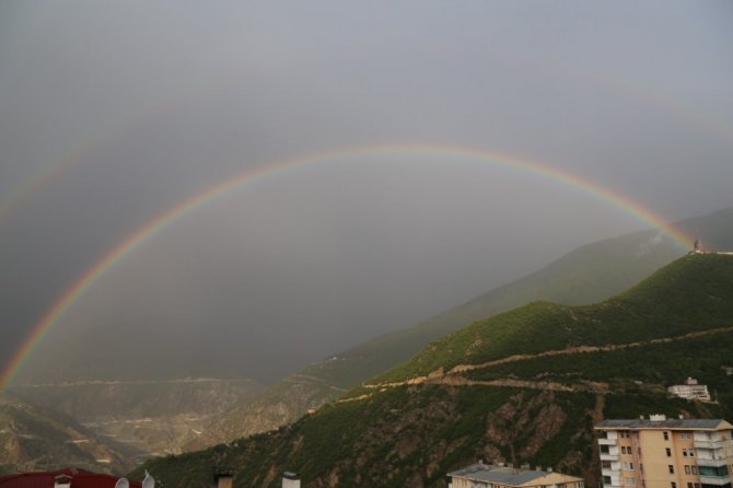 Artvin'de sağanak yağmurun ardından güneş açmasıyla oluşan kartpostallık gökkuşağı manzarası izleyenleri kendine hayran bıraktı.
