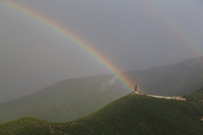 Artvin'de sağanak yağmurun ardından oluşan gökkuşağı kent sakinlerine muhteşem manzara sundu. Atatürk heykeli ile Çoruh Nehri Vadisi arasında doğup batan gökkuşağı görenleri kendine hayran bıraktı. Gökkuşağının renk cümbüşü ve bulutlarla bütünleşen haliyle kartpostallık görüntüleri aratmadı