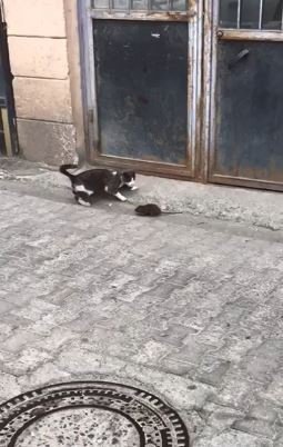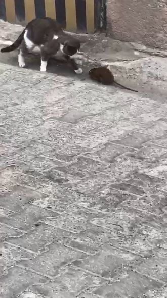 Artvin'de sokak ortasında insanlardan korkmayan fare, kendisini fark ederek üzerine yürüyen kediye karşılık verdi. Neye uğradığını şaşıran kedi, fareden kaçarken o anlar ise yoldan geçen bir kişi tarafından cep telefonu tarafından kaydedildi.