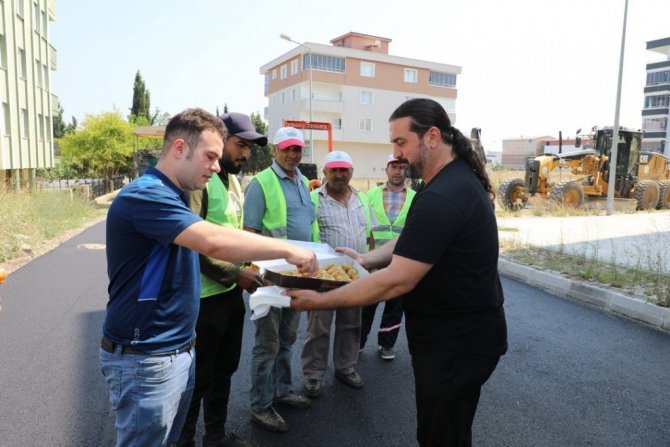 Belediye asfaltlama ekiplerini ziyaret eden İlkadım Belediyesi Meclis Üyesi Adem Yıldırım, yanında getirdiği tatlıyı onlara ikram etti.