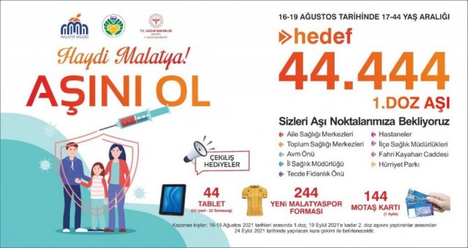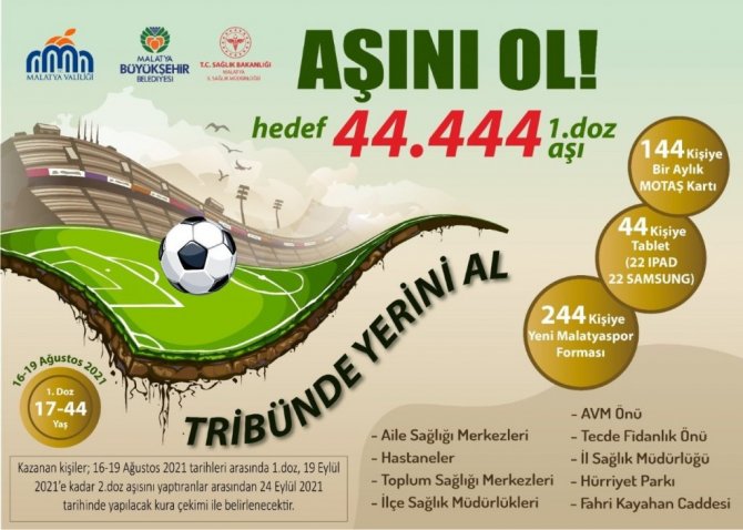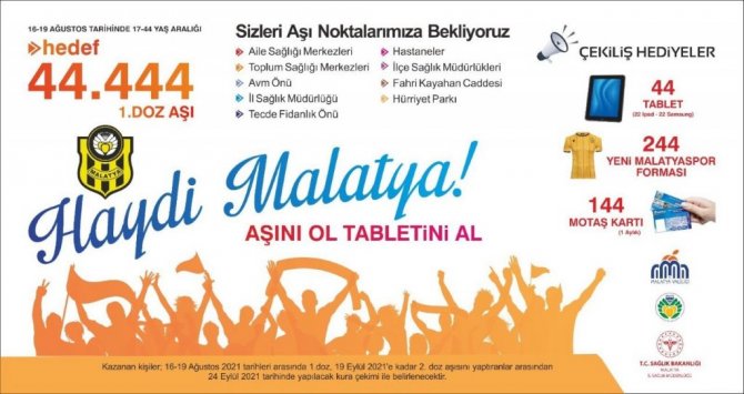 Covid-19 aşısı için kampanya başlatılıp, kampanyaya katılanlara 44 tablet,144 MOTAŞ otobüs kartı ile Yeni 244 Malatyaspor forması hediye edilecek.