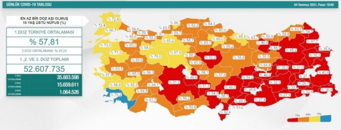 Ülke genelinde olduğu gibi Aydın'da da aşılama çalışmaları aralıksız devam ederken, il genelinde toplam 944 bin 209 oldu. Aşılanma yüzdesi 68,9 olan Aydın genelinde 5 Temmuz 2021 itibariyle 606 bin 684 birinci doz, 308 bin 351 ikinci doz aşılama yapıldı. Aydın Valiliği ve Aydın İl Sağlık Müdürlüğü koordinesinde alınan tedbirler de etkisini göstermeye devam ederken, Sağlık Bakanlığı verilerine göre Aydın hem vaka sayısı en düşük iller arasında hem de aşılanma yüzdesinde 8. sırada yer aldı. Nüfusa göre aşılanma rakamlarında yüzde 79,2'lik oranla Muğla birinci sırada yer alırken, yüzde 26,7'lik oranla Siirt son sırada yer aldı.