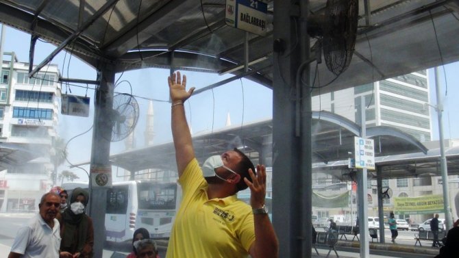 Şanlıurfa'da vatandaşlar, duraklara yerleştirilen buharlı serinletme sistemi ve vantilatörlerle serinliyor.