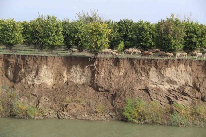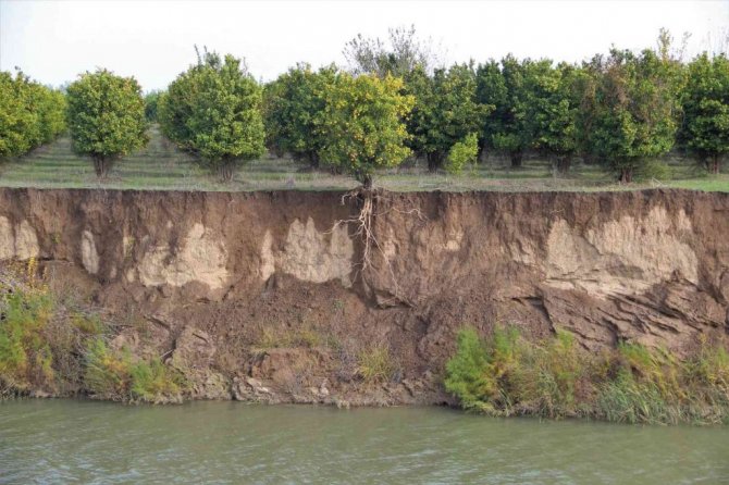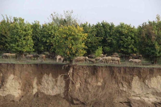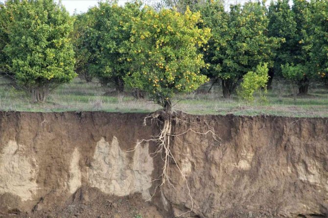Türkiye'nin en önemli sebze meyve üretim merkezi Antalya'da bir haftadır aralıklarla devam eden yağış etkisini göstermeye devam ediyor. Serik ve Aksu ilçelerinde seralar başta olmak üzere bazı tarım alanları da su altında kaldı. Bölgenin verimli toprakları ise geç gelen yağmurla suya doydu. Boztepe Mahallesi sınırlarından geçen Aksu Çayı kenarındaki bir portakal bahçesinde yoğun yağış nedeniyle çaya doğru toprak kaymaları oldu. Kayan bir toprak nedeniyle kenardaki bir portakal ağacının saçakları ortaya çıktı. Saçağın olduğu bölgede toprağın yaklaşık 1 metre ıslandığı görüldü.