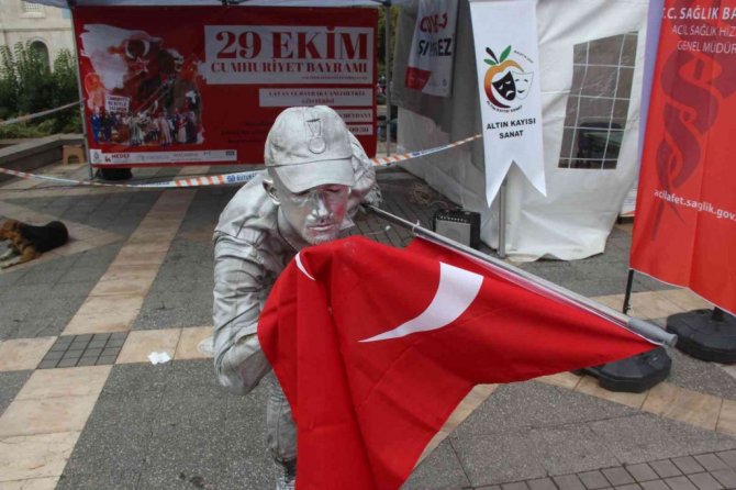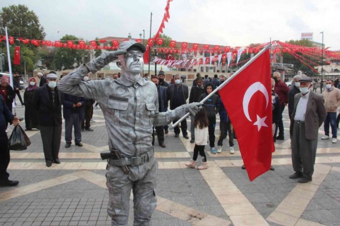 Malatya Soykan Meydanı'nda canlı heykel gösterisine sabah saatlerinde başlayan Tiyatro oyuncusu ve yönetmen İbrahim Şahin Uyumaz, 24 saat boyunca canlı heykel performansı sergileyeceğini söyledi. Asker selamı veren Uyumaz, bu alanda dünya rekoru kırmayı hedeflediğini vurguladı.