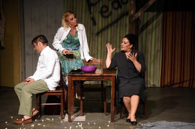 Murat Sarı’nın yönetmenliğinde iki perde olarak sahnelenen oyunda muhteşem bir performans sergileyen deneyimli oyuncular, Aliağalı tiyatroseverler tarafından ayakta alkışlandı. Gecenin sonunda sahneye gelen Aliağa Belediye Başkan Yardımcısı Mehmet Ali Özkurt, oyuncuları tek tek tebrik etti ve usta oyuncu Bedia Ener Öztep’e gecenin anısına Kyme antik kentine ait sikkelerin tuğrası ile işlenmiş cam tabak hediye etti.