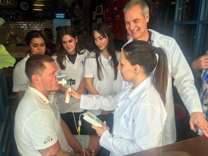 Çevre halkı tarafından yoğun ilgi gösterilen etkinlikte, katılımcılara taşınabilir spirometre cihazı ile solunum fonksiyon testi uygulandı.