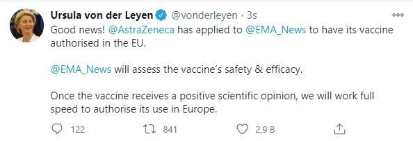Dünya genelinde birçok ülkede korona virüse karşı aşı çalışmaları sürüyor. Avrupa Komisyonu Başkanı Ursula von der Leyen sosyal medya hesabından yaptığı paylaşım ile AstraZeneca ve Oxford Üniversitesi tarafından ortak geliştirilen Covid-19 aşısının Avrupa ülkelerinde kullanımı için Avrupa İlaç Ajansı'na (EMA) başvurduğunu duyurdu. Leyen, başvuruyu "İyi haber! AstraZeneca aşısının AB'de kullanımı için EMA'ya başvuruda bulundu" ifadeleri ile duyurdu. EMA'nın aşının güvenliğini ve etkinliğini değerlendireceğini belirten Leyen, "Değerlendirme sonucu olumlu olursa aşının Avrupa'da kullanımına izin vermek için tüm hızımızla çalışacağız" dedi.