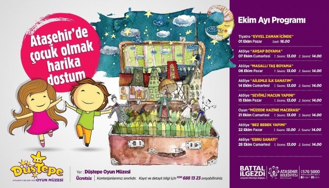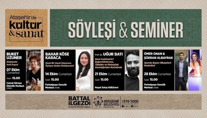 29 Ekim Cumhuriyet Bayramı dolayısıyla Prof. Dr. Emre Kongar’ın konuk olacağı “Atatürk Devrimlerinin Günümüzdeki Anlamı” konferansı Neşet Ertaş Kültürevi’nde düzenlenecek. Söyleşi ve seminerde Buket Uzuner ile “Edebiyatta Kedi İmgesi” üzerine 7 Ekim’de keyifli bir söyleşi gerçekleşecek. Psikolog Dr. Bahar Köse Karaca ile de “Güzel Bir Hayat İstiyorum, Öyleyse Neden Erteliyorum?” konulu merak uyandıran bir seminer 14 Ekim’de yapılacak. Prof. Dr. Uğur Batı ile tüketim çılgınlığı üzerine “Nasıl Sadeleşiriz? Bağımlılıklarımız, Tüketim ve Mutsuzluk Hastalığından Kurtulmak” konulu seminer 21 Ekim’de Neşet Ertaş Kültürevi’nde olacak. Ömer Onan ve Şükran Albayrak ile “Sporda Başarı Hikayeleri: Basketbol” isimli sohbette Türk basketbolunun hem erkek hem de kadın branşlarına yıllar boyunca damgasını vurmuş iki basketbol efsanesi Ataşehir’de ağırlanacak. Atölye çalışmaları kapsamında “Masal Yoga”, “Çocuklar İçin Yazı”, “Çağdaş Sanatın Abecesi”, “Şiir Atölyesi”, “Yazı Atölyesi”, “Temel Fotoğraf Atölyesi” ve “Sinema Atölyesi” ile bir ay boyunca 5 yaşından yetişkinlere kadar tüm Ataşehirlilere yönelik etkinlikler yapılacak. Ekim ayında Düştepe Oyun Müzesi’nde düzenlenecek etkinliklerde “Evvel Zaman İçinde” çocuk tiyatrosuyla birlikte “Ahşap Boyama”, “Masallı Taş Boyama”, “Ailemle İlk Sanatım”, “Sevimli Macun Yapımı”, “Müzede Hazine Macerası”, “Bez Bebek Yapımı” ve “Ebru Sanatı” atölyeleri çocukları bekliyor.