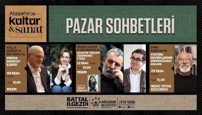 Geleneksel hale gelen pazar sohbetlerinde ise ilk olarak şiirlerini edebiyat dünyasının zirvesine diken Fazıl Hüsnü Dağlarca, aramızdan ayrılışının 9. yıl dönümünde anılacak. “Dağlarca’yı Görsel Radyo’da Anlatıyoruz” isimli panel 15 Ekim’de Neşet Ertaş Kültürevi’nde düzenlenecek. Sinema ve edebiyatın iki önemli ismi Atilla Dorsay ve İnci Aral’ın “Sinema- Edebiyat İlişkisi” üzerine yapacağı sohbet 8 Ekim’de MSKM’de yapılacak. Şair, yazar, tiyatro-sinema oyuncusu ve yönetmen Orhan Alkaya ile Doğan Kitap Genel Yayın Yönetmeni Cem Erciyes, yazar Gülşah Elikbank moderatörlüğünde bir araya gelecek. “Sanatın Toplum Üzerindeki Etkisi” paneli ise 22 Ekim’de MSKM’de yapılacak.