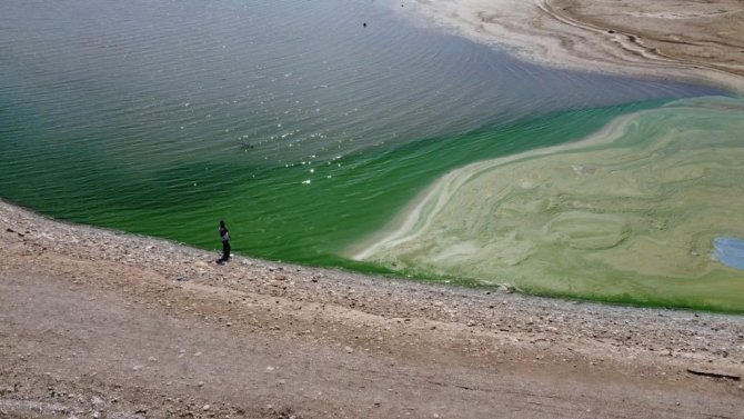 Adıyaman'da Atatürk Barajı göletinin bir kısmı yeşil renge büründü.