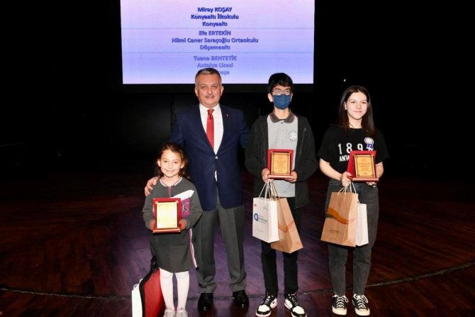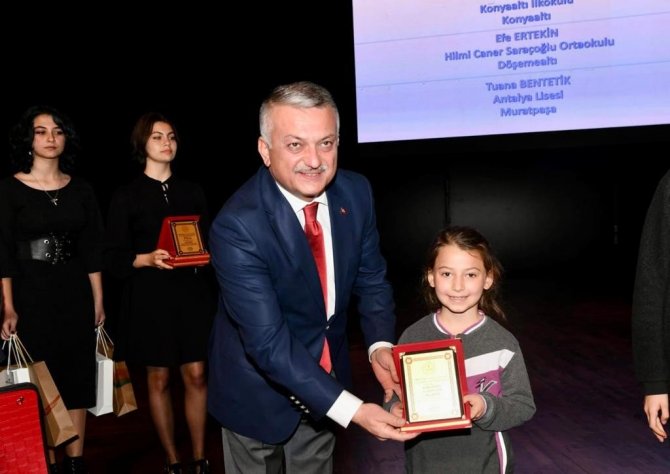 Vali Yazıcı yarışma sonucu dereceye giren; şiir dalı birincisi Hilmi Caner Saraçoğlu Ortaokulu öğrencisi Efe Ertekin, kompozisyon dalı birincisi Muratpaşa Antalya Lisesi 12'inci sınıf öğrencisi Tuana Bentetik ve resim dalında birinci olan Konyaaltı İlkokulu 2'nci sınıf öğrencisi Miray Koşay'a plaketlerini verdi.