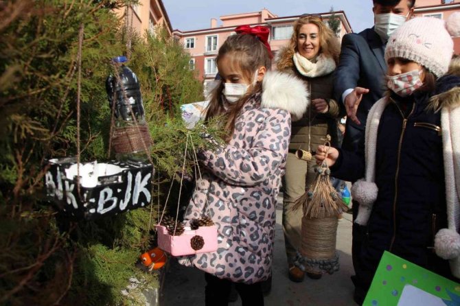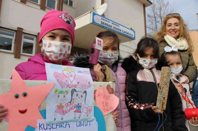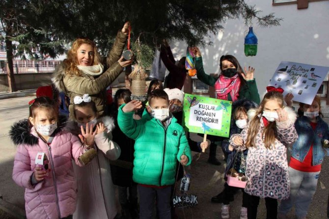 Amasya'da çocuklar kuşlara umut olmak için harekete geçip atık malzemelerden hazırladıkları kuş yuvalarını ve yemlikleri ağaçlara astı.