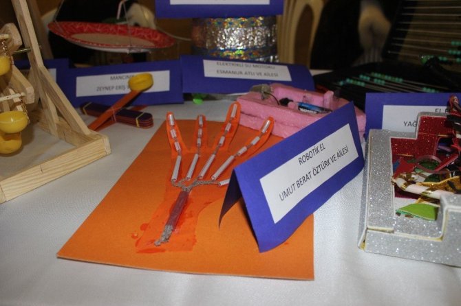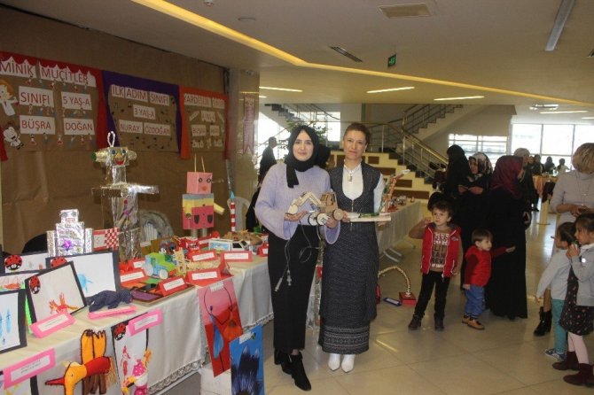 ’Küçük bir buluş büyük bir gelecek’ isimli sergide öğrencilerin ve velilerinin katılımıyla artık materyallerden yeni buluşlar yaparak geleceğe yön verecek icatlar ortaya koydular.