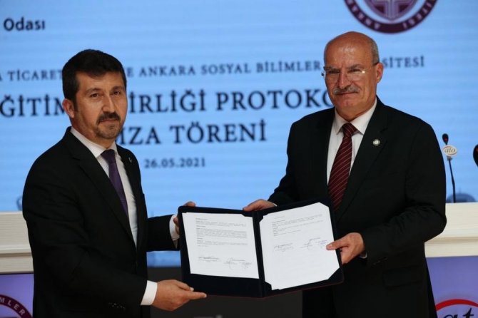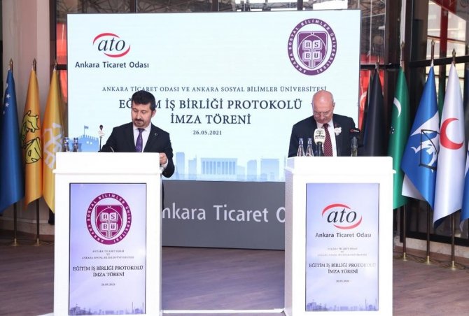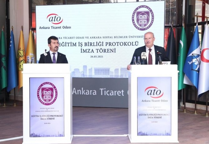 ATO ile Ankara Sosyal Bilimler Üniversitesi arasında Ankara'nın girişimcilik ve ticari kapasitesinin artırılmasına yönelik araştırma, eğitim, proje geliştirme çalışmalarını içeren ve lisansüstü eğitim programlarından indirimli yararlanmayı kapsayan iş birliği protokolü düzenlenen törenle imzalandı.
