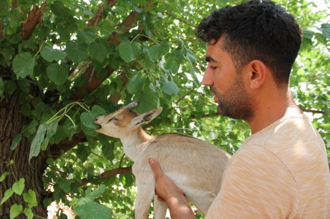 Adıyaman'da ayakları tutmadığı için yürüyemeyen yavru yaban keçisini doğada ölüme terk etmeyen Mahmut Baykuş, yavru yaban keçisini evinde besliyor.