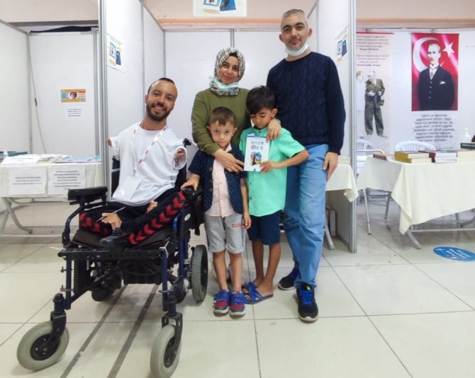 Bedensel engelli milli yüzücü Sefa Yurtkölesi, Manisa'da 4. Kitap fuarında, ilk eseri olan ve ayaklarını kullanarak yazdığı Hayatın Sefa'sı kitabını...