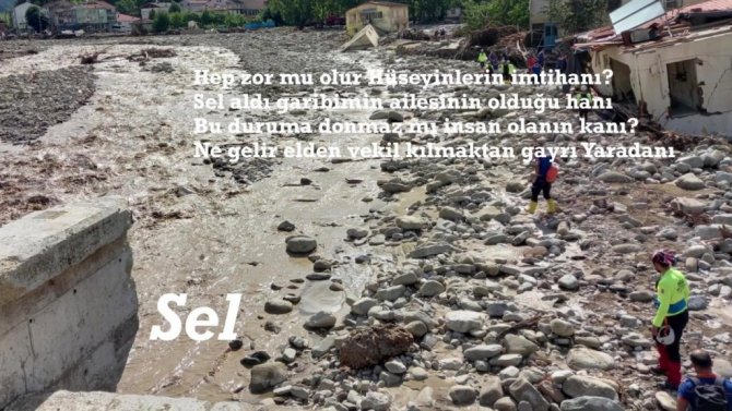 Hep zor mu olur Hüseyinlerin imtihanı?/ Sel aldı garibimin ailesinin olduğu hanı/ Bu duruma donmaz mı insan olanın kanı?/ Ne gelir elden vekil kılmaktan gayrı Yaradanı/