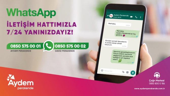 Aydem ve Gediz Perakende, çözüm odaklı hizmetlerine bir yenisini daha ekledi. Müşteri memnuniyetini ön plana alarak hayata geçirdikleri WhatsApp servisi sayesinde müşteriler ile 7 gün 24 saat daha hızlı iletişim sağlayacak. Aydem Perakende Aydın, Denizli ve Muğla illerinde 0850 575 00 01, Gediz Perakende ise İzmir ve Manisa illerinde 0850 575 00 02 telefon numaralı kurumsal WhatsApp iletişim hattıyla müşterilerine fatura ve abonelik işlemleri, bilgi güncelleme, kampanya ve indirimli elektrik gibi birçok konuda etkin şekilde hizmet sunacak. Aydem ve Gediz Perakende, aynı zamanda, birçok konuda, müşterilerine çağrı merkezi kanalıyla da hizmet vermeye devam edecek.