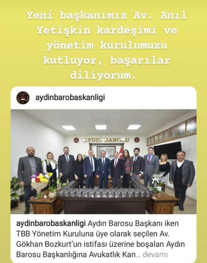 Aydın Barosu Başkanı Gökhan Bozkurt'un istifa etmesi üzerine boşalan başkanlık koltuğu adeta "jet hızı'yla doldu. Yönetim Kurulu arasında yapılan seçim ile Avukat Anıl Yetişkin, Aydın Barosu'nun yeni başkanı oldu. Konu ile ilgili Aydın Barosu Başkanlığı'ndan yapılan açıklamada "Aydın Barosu Başkanı iken TBB Yönetim Kuruluna üye olarak seçilen Av. Gökhan Bozkurt'un istifası üzerine boşalan Aydın Barosu Başkanlığına Avukatlık Kanunu 96. Maddesi gereğince Yönetim Kurulu arasından yapılan seçimle Av. Anıl Yetişkin seçilmiştir" ifadeleri yer aldı.