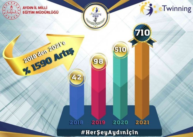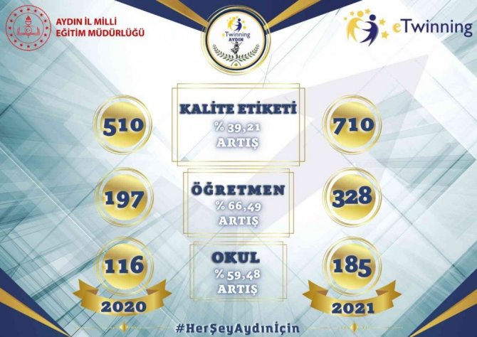 Aydın İl Milli Eğitim Müdürlüğü, 328 öğretmenin öğrencileriyle birlikte hazırlamış olduğu 2021 yılındaki 492 eTwinning projesi ile 492'si ulusal ve 218'i Avrupa olmak üzere toplam 710 Kalite Etiketi alarak, son üç yıldaki başarı oranını yüzde bin 590 arttırarak bir rekora daha imza attı. 2005 yılında Avrupa'da kurulan ve Türkiye'nin 2009 yılında dahil olduğu öğrenci merkezli etkinliklerle akademik ve sosyal başarının artırılmasını hedefleyen eTwinning platformunun etiketlerini önemsediklerini belirten Aydın İl Milli Eğitim Müdürü Seyfullah Okumuş, ekibini başarısından dolayı kutladı.