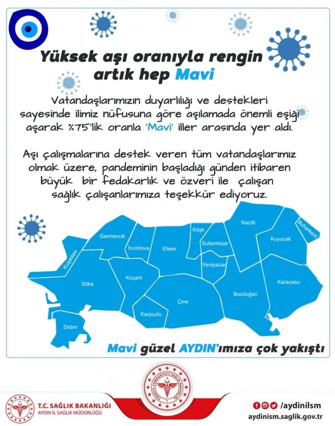 Korona virüs ile mücadele kapsamında Aydın genelinde aşılama çalışmaları aralıksız devam ederken, il genelinde aşılama rakamları da sevindirici düzeye ulaştı. Sağlık Bakanlığı tarafından açıklanan aşılanma verilerine göre Aydın yüzde 75,2 olurken, ülke genelindeki tabloda da maviye büründü. Aydın'ın aşılanma yüzdesi en iyi iller arasında 7. sıraya yükselmesinin ardından Aydın İl Sağlık Müdürü Dr. Osman Açıkgöz başarıda katkısı olan başta sağlıkçılar olmak üzere vatandaşlara teşekkür etti.
