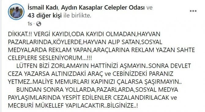 Sosyal medyadan paylaşım yaparak usulsüz alım-satım yapanlara seslenen Kadı paylaşımında şu ifadelere yer verdi; "Dikkat! Vergi kaydı, oda kaydı olmadan hayvan pazarlarında ve köylerde hayvan alıp satan, sosyal medyada reklam yapan, araçlarına reklam yazan sahte celeplere sesleniyorum. Lütfen bizi zorlamayın, haddinizi aşmayın. Sonra devlet ceza yazarsa altınızdaki ara ve cebinizdeki paranız yetmez. Maliye memurları kapınızı çalarsa şaşmayın. Bundan sonra yollarda, pazarlarda, sosyal medya paylaşımlarında tespit edilenler cezalandırılacak ve mecburi mükellef yapılacaktır. Bilginize."