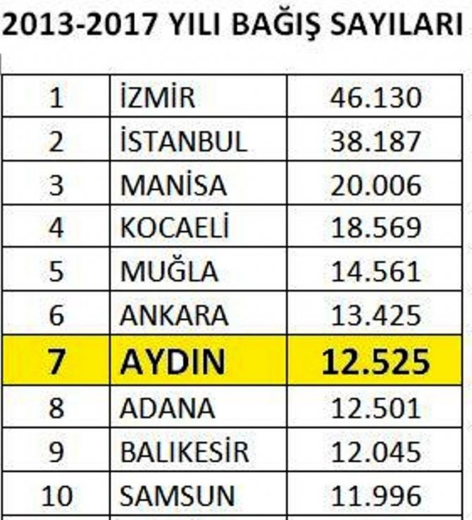 Aydın, organ bağışı konusunda Ekim 2017’de 10 bin 914 bağışçı sayısı ile 10’uncu sırada yer alırken, 05 Aralık 2017 tarihi itibariyle toplam 12 bin 525 bağışçı sayısına ulaşarak Türkiye genelinde 7’inci sıraya yükseldi.