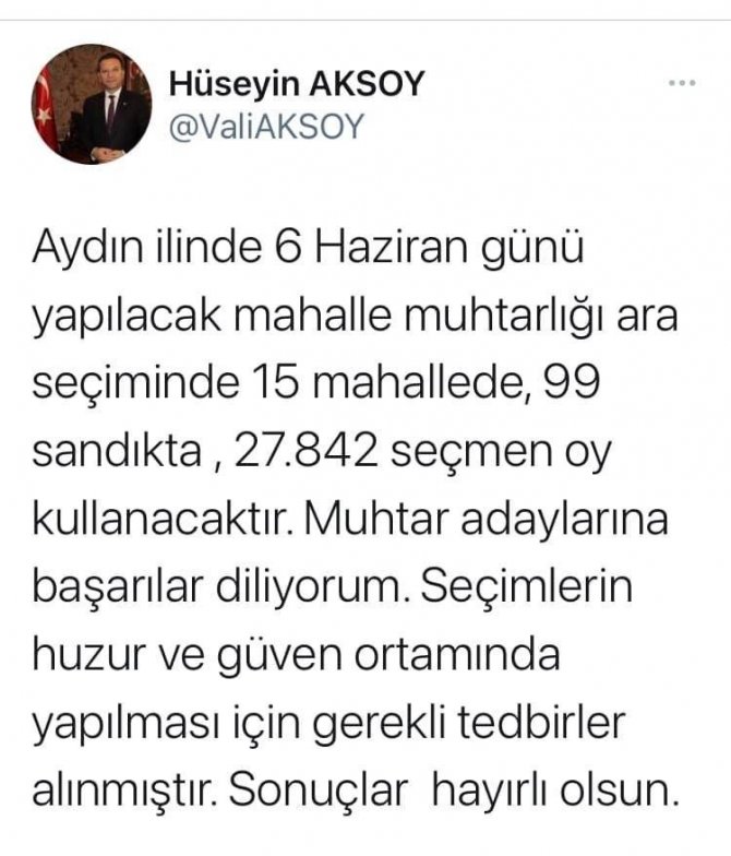 Aydın Valisi Hüseyin Aksoy da sosyal medya hesabından yaptığı paylaşımda seçimlerin hayırlı olmasını dileyerek, "Aydın ilinde 6 Haziran günü yapılacak olan mahalle muhtarlığı ara seçimlerinde 15 mahallede 99 sandıkta, 27 bin 842 seçmen oy kullanacaktır. Muhtar adaylarına başarılar diliyorum. Seçimlerin huzur ve güven ortamında yapılması için gerekli tedbirler alınmıştır. Sonuçlar hayırlı olsun" ifadelerini kullandı.